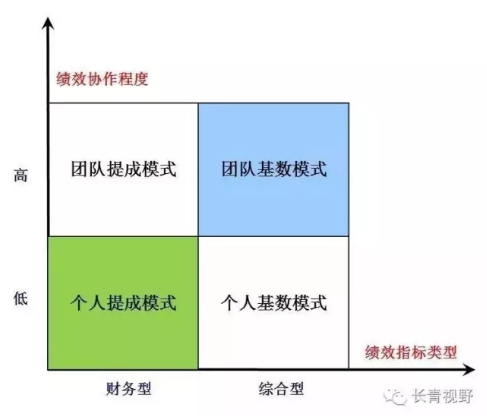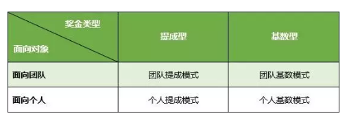 考慮到獎(jiǎng)金可能需要面向團(tuán)隊(duì)和個(gè)人獎(jiǎng)金分別設(shè)計(jì),獎(jiǎng)金又有基數(shù)型和提成型兩種類型,按照排列組合原理,可以產(chǎn)生六種可能的獎(jiǎng)金模式,具體如下: