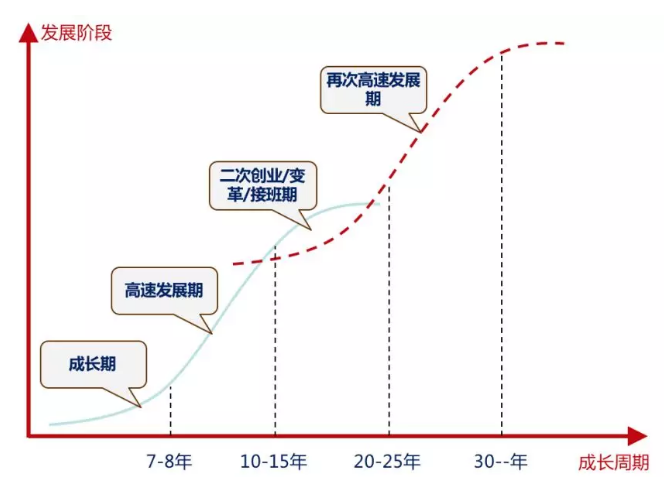 在企業(yè)從小到大的成長過程中,將經(jīng)歷不同的發(fā)展階段:首先是成長期(創(chuàng)業(yè)期),然后是高速發(fā)展期,進一步再發(fā)展到平穩(wěn)發(fā)展階段和二次創(chuàng)業(yè)/變革轉(zhuǎn)型期。如果二次創(chuàng)業(yè)/轉(zhuǎn)型發(fā)展成功,企業(yè)就再進入另外一個高速發(fā)展周期,如此周而復(fù)始。如下圖所示: