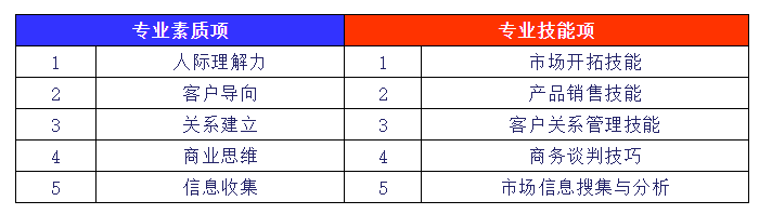 專業(yè)素質(zhì)項專業(yè)技能項1人際理解力1市場開拓技能2客戶導(dǎo)向2產(chǎn)品銷售技能3關(guān)系建立3客戶關(guān)系管理技能4商業(yè)思維4商務(wù)談判技巧5信息收集5市場信息搜集與分析