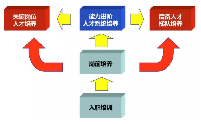 在一個成熟的企業(yè)中,人才培養(yǎng)是一套完整體系。首先是入職培訓(xùn),然后是崗前培訓(xùn),再往上就是能力進階人才培養(yǎng)體系,以及關(guān)鍵崗位人才培養(yǎng)體系和后備人才梯隊培養(yǎng)體系。如下圖所示:
