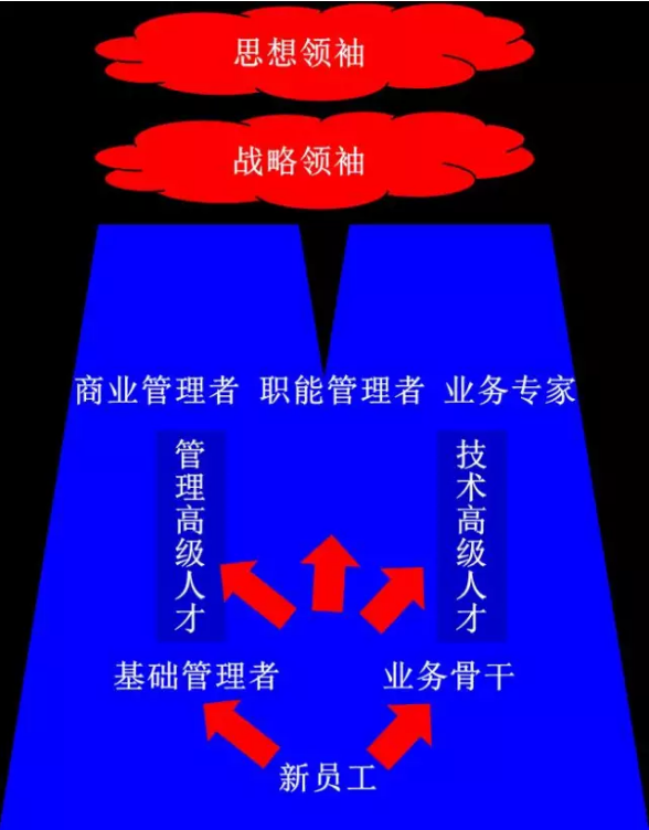 在建立企業(yè)內(nèi)部職業(yè)發(fā)展機(jī)制方面,華為的“雙金字塔”模型很有參考借鑒意義。思想領(lǐng)袖和戰(zhàn)略領(lǐng)袖集中在思想方法上,將思想轉(zhuǎn)化為戰(zhàn)略框架和規(guī)則,從而在戰(zhàn)略格局等結(jié)構(gòu)性管理上奠定公司成功基礎(chǔ)。商業(yè)管理者、職能管理者、業(yè)務(wù)專家是影響公司未來戰(zhàn)略的關(guān)鍵人才,是具有業(yè)務(wù)深度和廣度的T型人才。當(dāng)然,如果企業(yè)不想另起爐灶,對(duì)原有職位體系進(jìn)行系列化設(shè)計(jì)也是可行的路徑。