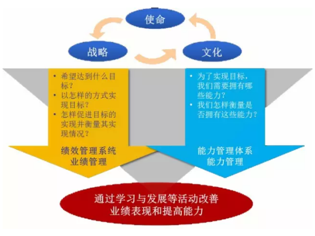 企業(yè)組織若想保持機體健康,“協(xié)調(diào)一致、執(zhí)行力和自我更新能力”三個要素至關(guān)重要!企業(yè)的戰(zhàn)略和經(jīng)營目標(biāo)確定后,業(yè)績管理體系、能力管理體系就成為保證戰(zhàn)略和經(jīng)營目標(biāo)落地、達成的左膀右臂(如下圖所示),是“執(zhí)行力”的基礎(chǔ)。業(yè)績管理體系屬于組織的“動力管理機制”,旨在培養(yǎng)員工的忠誠度與熱忱,鼓勵員工盡力追求最佳業(yè)績;“能力管理機制”包括組織能力和人才,以確保組織能夠執(zhí)行戰(zhàn)略、建立競爭優(yōu)勢。