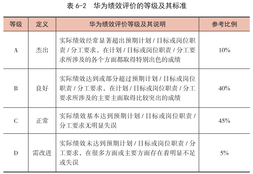 其次,在考核中,華為堅持兌現(xiàn)A占10%、B占40%、C占45%、D占5% 的基本比例。華為有接近一半員工的考核結(jié)果是C。